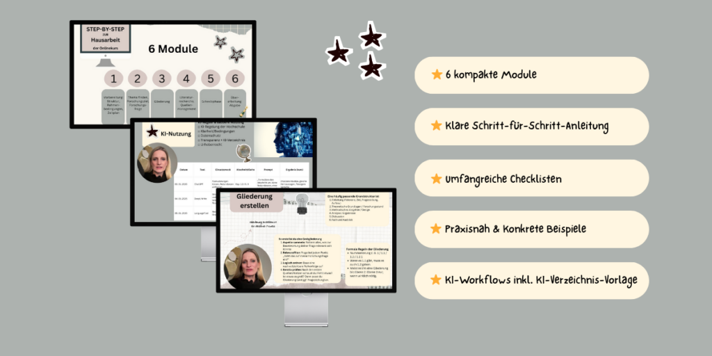 „Step by Step zur Hausarbeit“ ist ein kompakter Kurs, der dich in kurzer Zeit von „Ich weiß nicht, wie ich anfangen soll“ zu „Ich hab eine Struktur – und ich schreibe jetzt“ bringt.